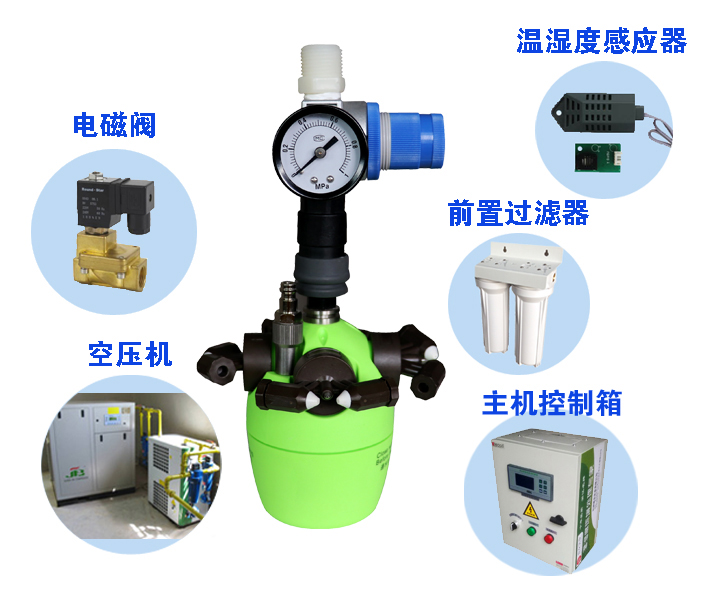 利用空壓機氣體將水霧化,水霧顆粒細(xì)、揮發(fā)快、效率高。